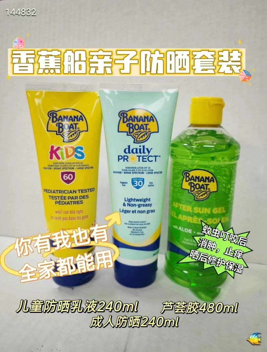 + Free Shipping夏天必备,加拿大🇨🇦直邮¥299/组。全家都能用的香蕉船亲子防晒套装。便宜大腕,四季可用。小盆友用黄色,无泪配方,安全无副作用;大人用蓝色,轻量级防晒,日常通勤出行足够啦!质地轻薄水润好推开,敏感肌可用。芦荟胶就更厉害啦!添加了库拉索芦荟汁成分,夏天被蚊虫叮咬之后,涂上Ta,消肿止痒立竿见影,更可以晒后修复、水润舒缓,敷完之后整个皮肤都是水嫩的,秋冬季还可以当面膜,舒缓肌肤效果真的YYDS。
