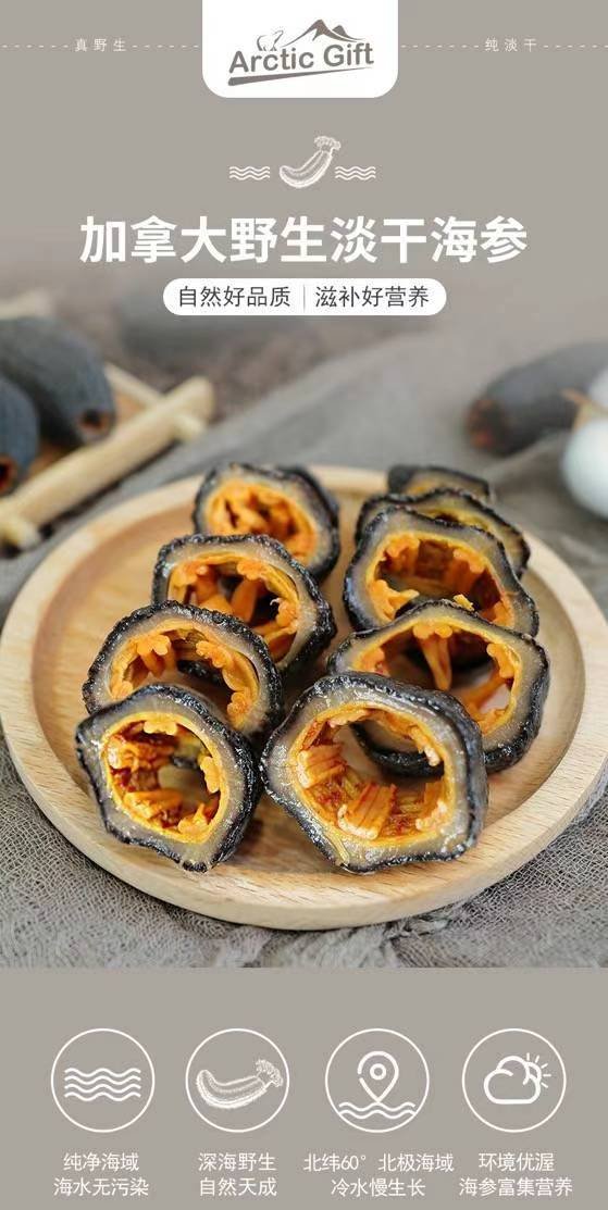 加拿大Arctic Gift纯野生北极海参,秋季滋补正当时[强]加拿大野生海参,采用原装进口干圆筒海参加工,无任何添加,真正起到温补作用,肉质细腻[强]口感Q弹[强]鲜香无比[强]快捷方便。这个品牌的在打折,30头大个头的599一袋,1160两袋加拿大直邮。