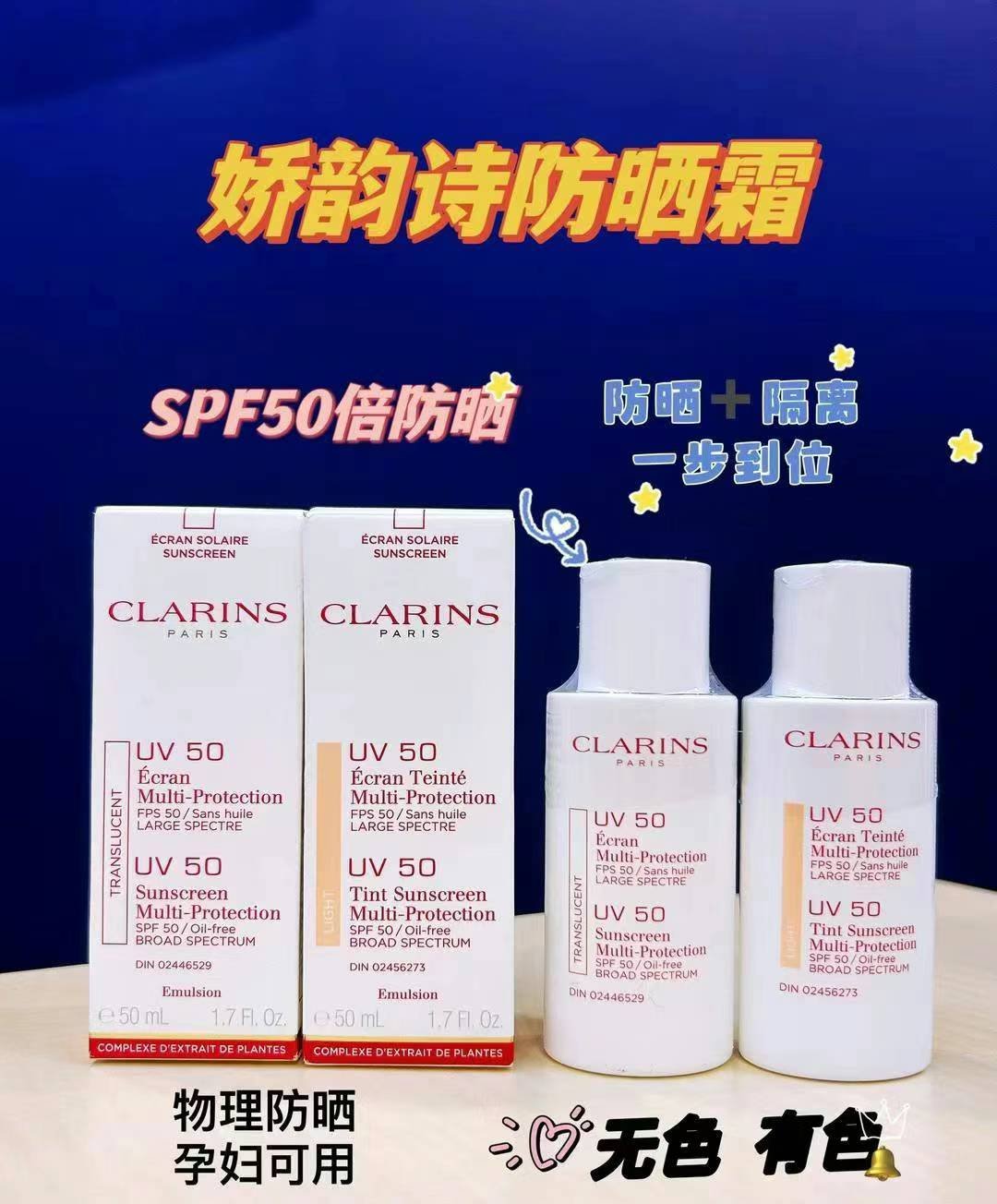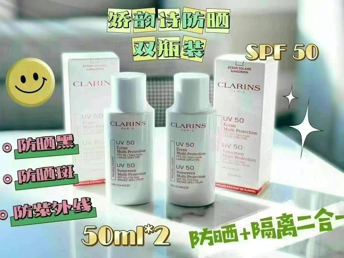 Clarins娇韵诗防晒 50ml无色防晒乳 🌿孕妇,宝宝都可放心使用,SPF50防晒美白隔离于一身。🌿轻薄不油腻 不闷痘,成份天然无添加,既防辐射又防灰尘,上妆自然不搓泥。