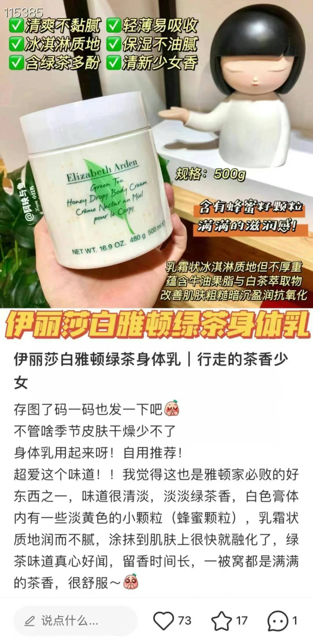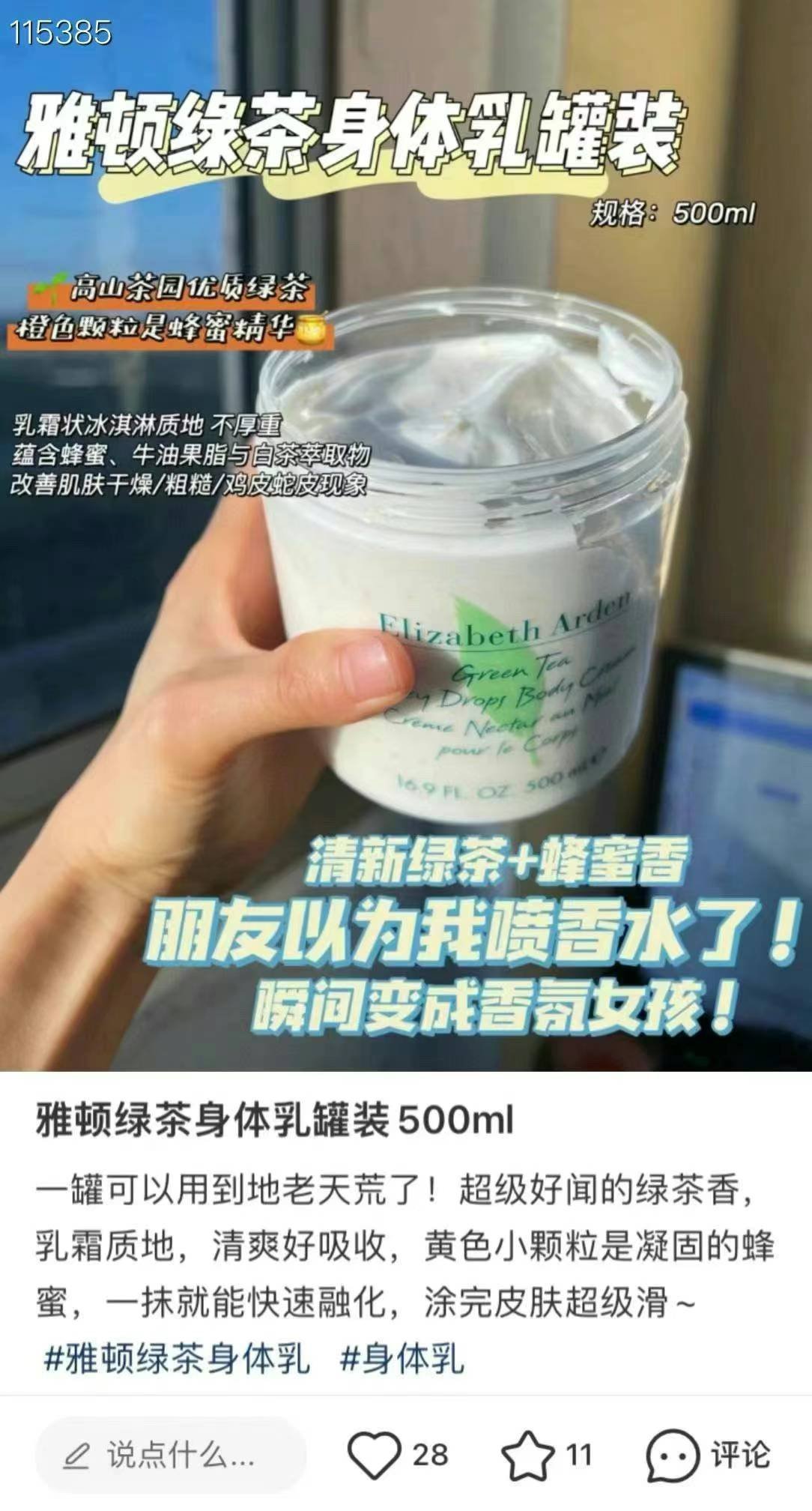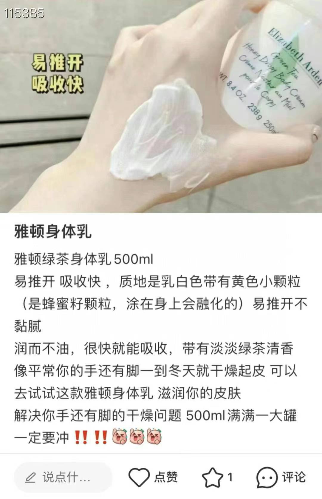 超省又好用,大包装500g➕500g=1000g,328/组(2瓶1kg)。日常身体乳之选|雅顿绿茶蜜滴舒体霜,质感丝滑,🍃绿茶清香,最爱的平价身体乳!很多MM对身体乳的要求:保湿度必须好,不油腻,抗敏感,天然成分,最主要还是香味很重要啊!很多别的品牌味道会比较腻而且冲,但零差评的这款雅顿身体乳,含有绿茶🍃以及蜂蜜精华🐝,涂抹后有很清淡高级的绿茶味道。里面有黄色小金豆颗粒,它是蜂蜜精华,涂抹后就吸收在皮肤上,很好推开,全家老小都适用💃🏻