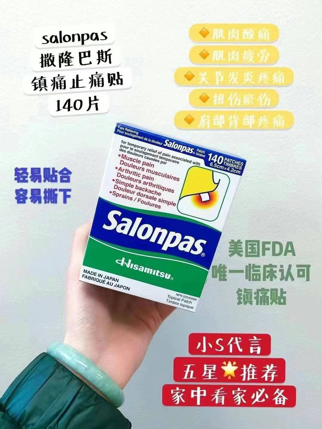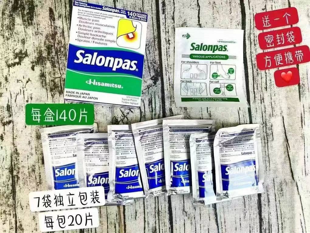 Salonpas 隆撒巴斯关节椎颈消炎痛止贴 包新装加量20💯 140贴/盒 Salonpas撒隆斯巴关节椎颈止痛贴,140贴皮,肤外用,每天用使不超过四次,每次贴用超不过8小。时密封式渗透:贴紧布贴患处有,效锁住药,力深入渗透发持挥久镇作痛用;易于撕贴轻:易贴合于颈部,肩及膊其他关部节位,便方易用;止比痛膏更效有:贴布含更多有效药成力份,提供很好很,持久的镇痛效果药,力持久不易发挥。