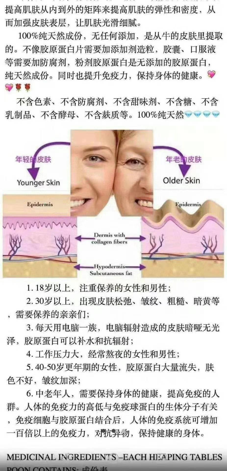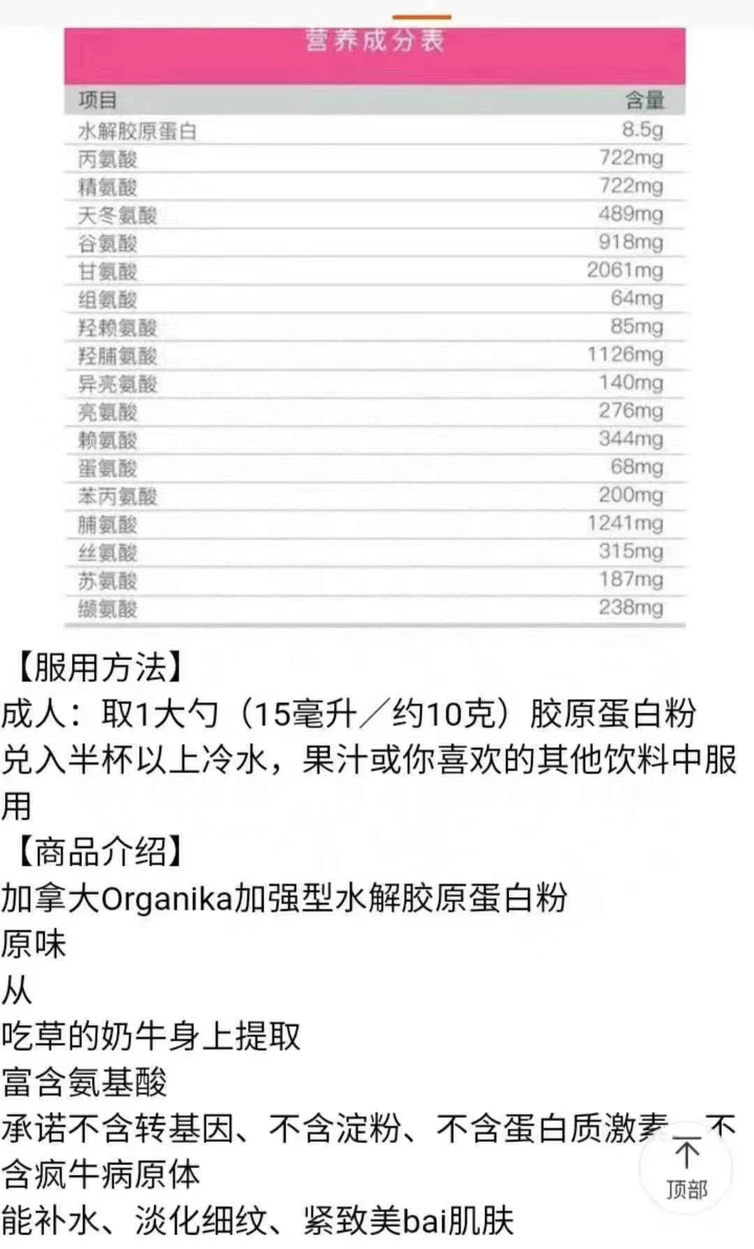 同时富含十七种氨基酸,有效淡化肌肤纹,对皮肤,头发指和甲的健康重要,也是保持健康关节的关键。水解胶原蛋白非常容易被人体吸收,补充胶原的同时,刺激自身皮肤细胞生成更多的胶原蛋白,快速除皱。用服方法:混合1汤匙(8.5克)在半杯或更多的冷水,果汁或者其他您喜欢的饮料中饮用。天猫店250g的小罐卖278元,现在加拿大上架的2kg的大袋(相当于天猫店8罐的量哦)