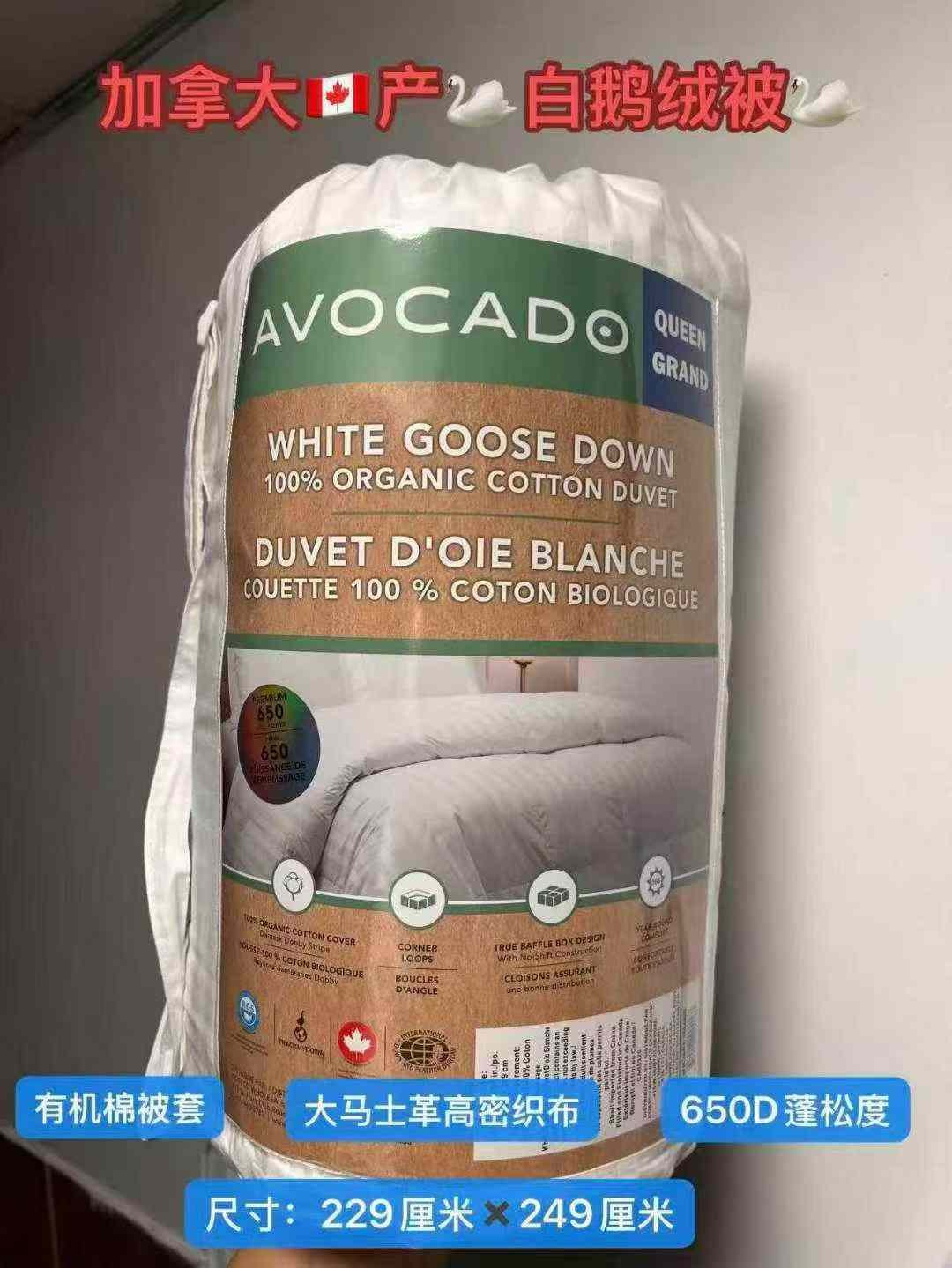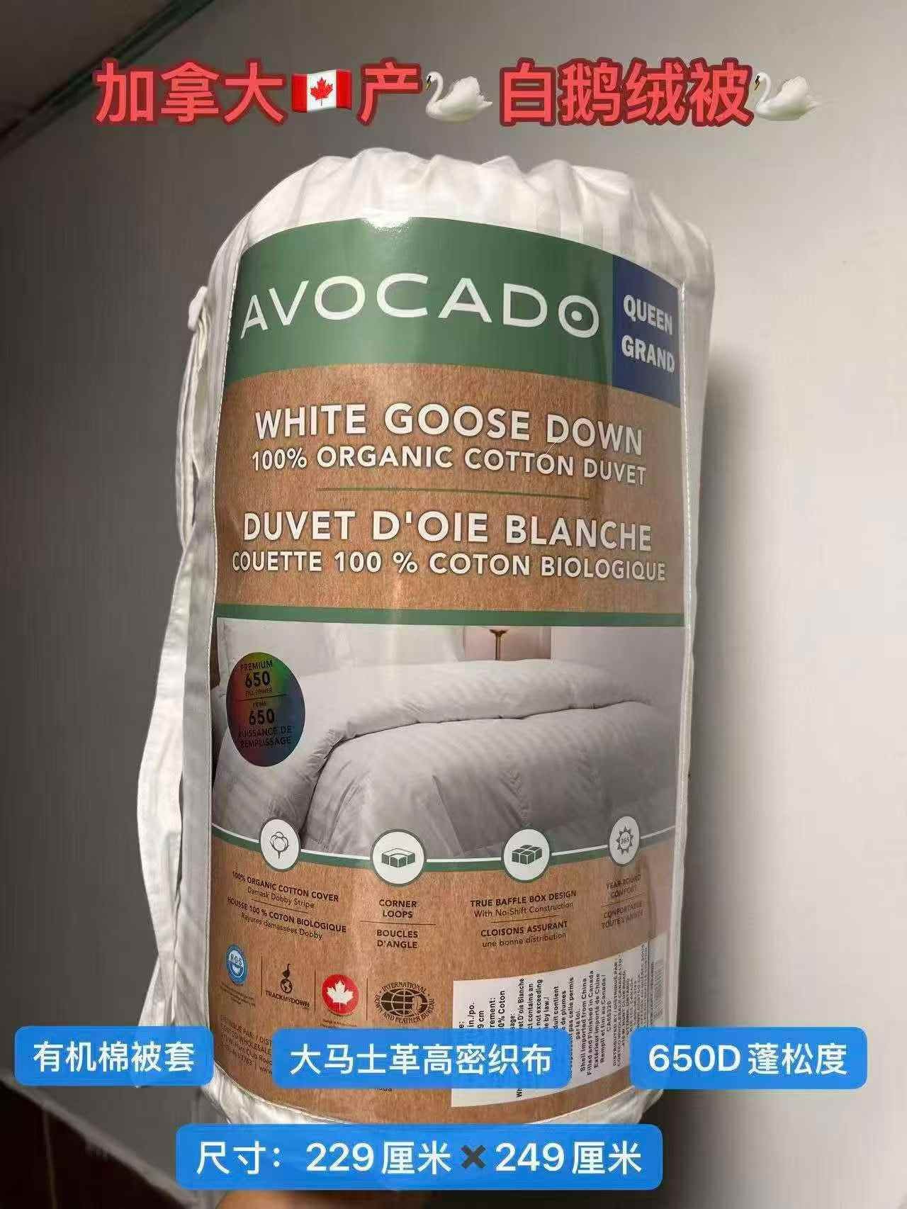 [庆祝][庆祝]千呼万唤的鹅绒被终于上架,断货好几年啦!🇨🇦加拿大本地生产的AVOCADO白鹅绒被,Queen size 小号,尺寸: 229cm*249cm,舒适软暖,鹅绒蓬松度高达650D,专利格子缝结,鹅绒不乱串,平平整整。100%有机全棉被套,品质优良,加拿大特价只要1680,直邮!