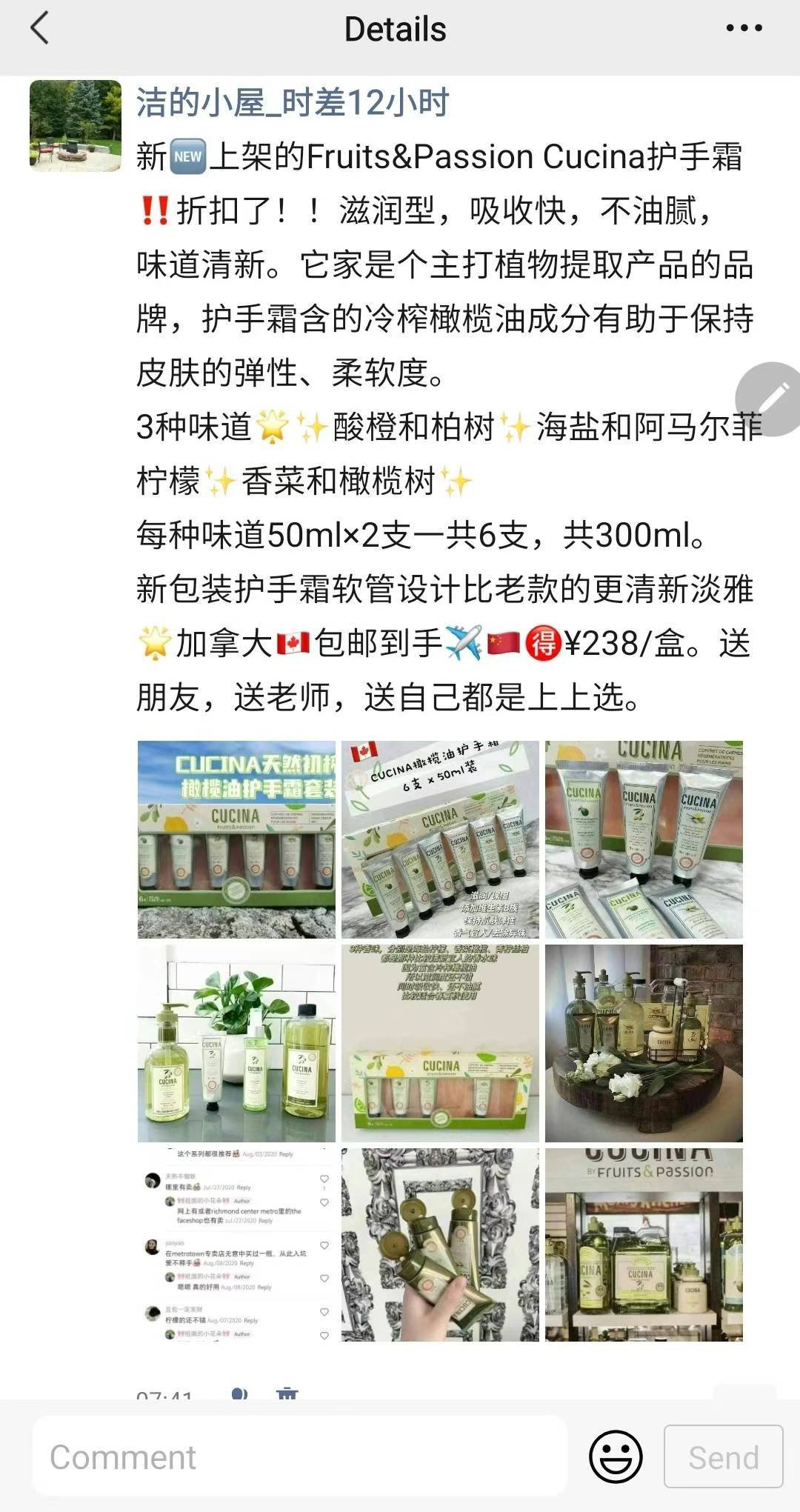 真的好用的!特价囤货别错过,仅4盒了。50ml/支。比正常30ml的多20ml。新🆕上架的Fruits&Passion Cucina护手霜‼️折扣了!!滋润型,吸收快,不油腻,味道清新。它家是个主打植物提取产品的品牌,护手霜含的冷榨橄榄油成分有助于保持皮肤的弹性、柔软度。