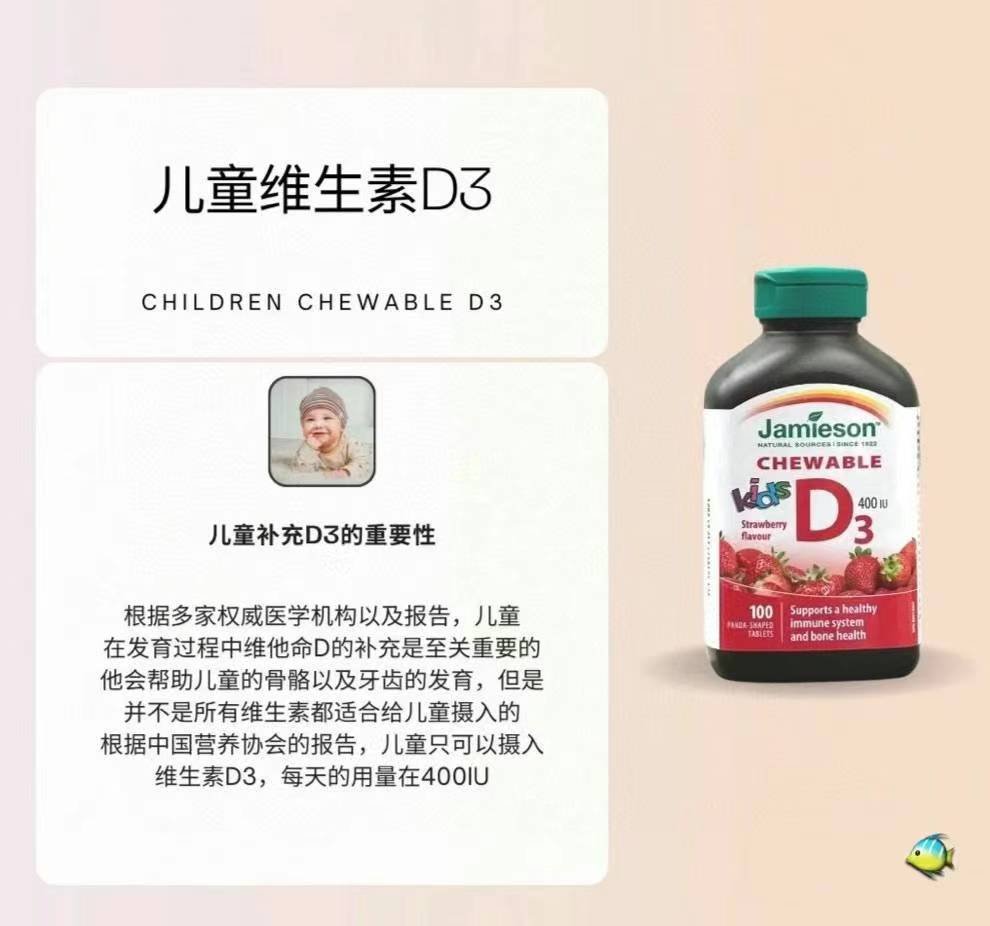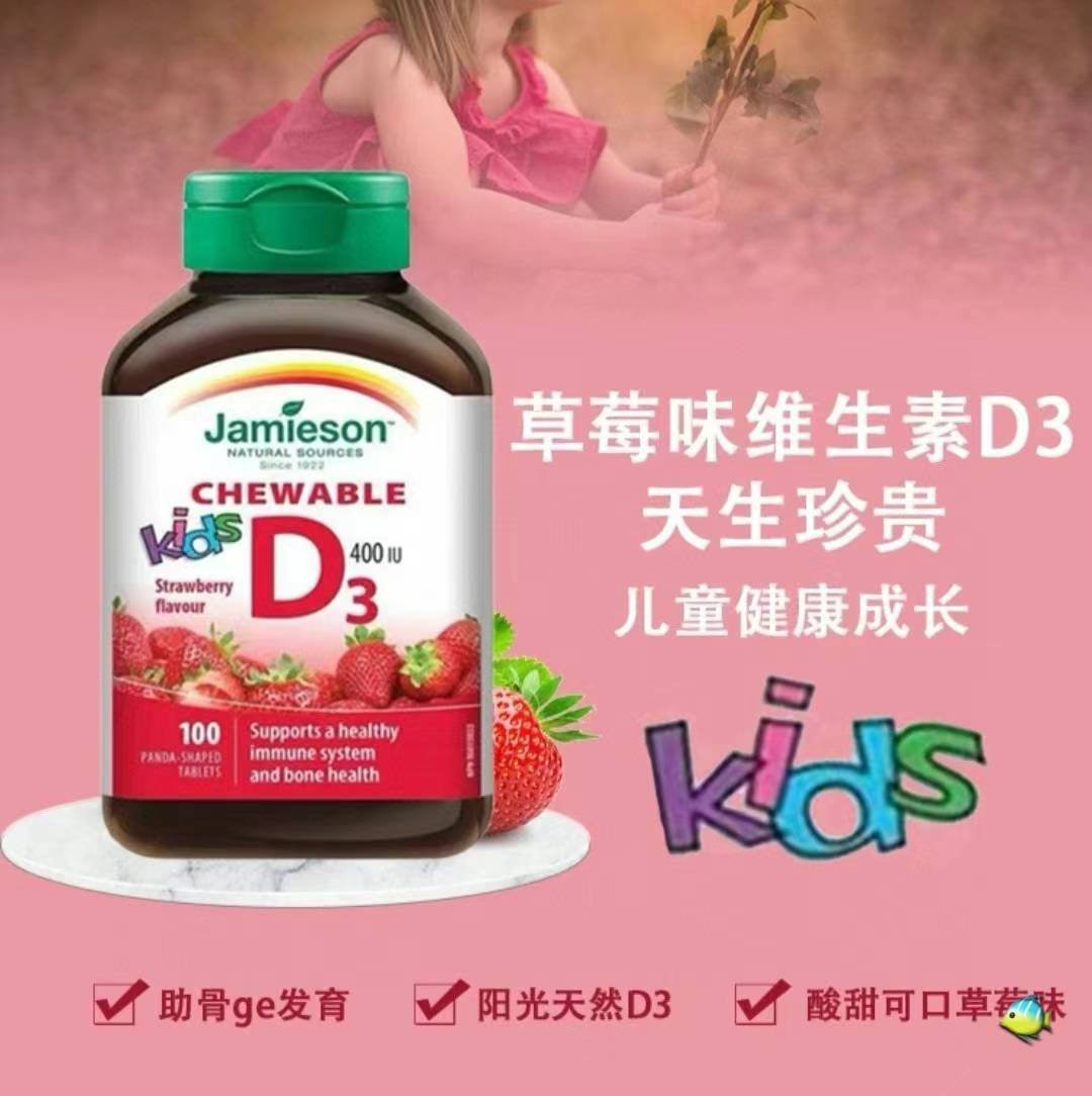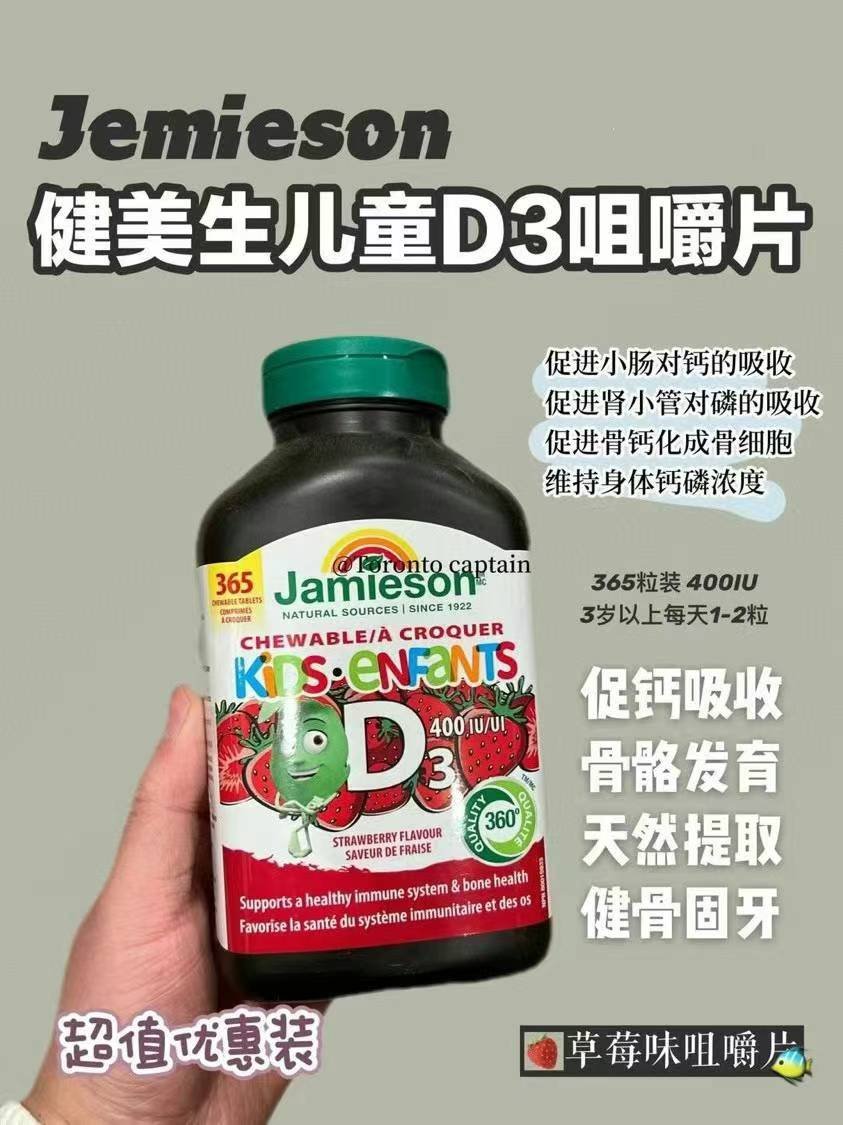 本周特价,加拿大🇨🇦直邮¥380/2瓶。Jamieson健美生儿童维生素D3咀嚼片365粒大瓶装,保质期到2026年2月。孩子们喜欢的可爱卡通形状,天然草莓味道,每片含400IU标准计量,弥补日照不足。促进钙吸收,适合长身体的宝宝们,有效预防佝偻病,更维护骨骼/牙齿健康。