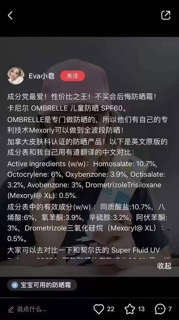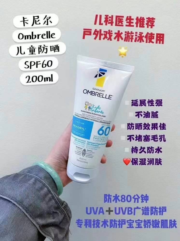 OMBRELLE是欧莱雅集团下的专业防晒品牌 只在加拿大有 有欧莱雅集团防晒黑科技专利成分MEXORYL!再加上物理防晒剂二氧化钛,这个是物化结合的防晒 了,看成分防护力很好了👍 保湿效果好,温和不刺激皮肤,防水防汗、透气,6个月以上宝宝和儿童,成人都能用。
